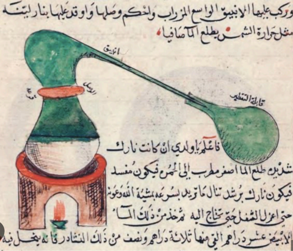 Many of these books were translated into Latin in the Middle Ages. Among his other significant books were Kitab al-Zuhra (Book of Venus) on the noble art of alchemy. Jabir dedicated this book to the Abbasid Caliph Haroun Al-Rashid. His books on chemistry, including his Kitab-al-Kimya (Book of Chemistry), Kitab Al Sabe’en (The Seventy Books), were translated into Latin and various European languages as well. These translations were popular in Europe for several centuries and have influenced the evolution of modern chemistry. One book he wrote, Kitab Al Ahjar (Book of Stones),4 was written in highly esoteric incomprehensible code, understood only by those initiated into his school of alchemy. It is claimed that the English word “gibberish,” which means nonsense, was derived from his name “Geber” and is believed to be related to his writings in code. Jabir is credited with the introduction of experimental methodology into alchemy and the invention of several chemical processes used in modern chemistry. These include crystallization, calcinations, sublimation and evaporation, the synthesis of acids (hydrochloric, nitric citric, acetic and tartaric acids), and distillation using his greatest invention, the alembic (Anbaiq). Other achievements included preparation of various metals, development of steel, dyeing of cloth and tanning of leather, varnishing of water-proof cloth, use of manganese dioxide in glass- making, prevention of rusting, and identification of paints and greases. He also developed aqua regia to dissolve gold. Jabir suggested three categories for the natural elements: Spirits, which vaporize on heating; metals like gold, silver, lead, iron and copper; and stones that can be converted to powder. This nomenclature could represent the beginning of more recent classifications of elements. Although ancient alchemy was concerned with the preparation of precious metals, Jabir dedicated his work to the development of basic chemical methods using experimentation and the study of chemical reactions and their principles, thus paving the road for transforming chemistry from the realm of myths and legends to a scientific discipline. It is stated that the development of chemistry in Europe can be traced directly to Jabir Ibn Hayyan.